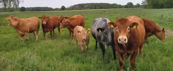 Ein Herzensprojekt auf unserem Hof ist die Rinderhaltung. Ninas große Leidenschaft gilt den Tieren. Heute leben bei uns 45 Mutterkühe mit ihrer Nachzucht sowie zwei Zuchtbullen. Sie wachsen artgerecht auf, mit viel Auslauf, Weidegang im Sommer und Strohstall im Winter.